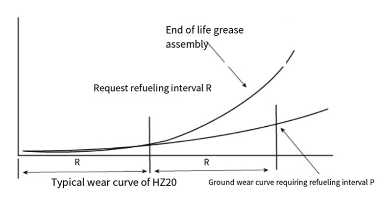Ang HZ20 na materyal ay sumusunod sa espesyal na tuntunin sa pagsusuot tulad ng ipinapakita sa Fig.4, ang infinitesimal abrasion ay maaaring mangyari sa R phase kapag nilagyan ng grasa at pagkatapos ay ini-install. Ngunit pagkatapos ng R phase. mawawala ang kundisyon ng boundary lubrication at magiging exaggerated ang suot. Kung mag-refill ka ng langis. ang produkto ay maaaring hawakan nang husto sa pamamagitan ng hindi kapansin-pansing pagsusuot at ang buhay nito ay mapapahaba din nang husto. Samakatuwid ang bentahe ng HZ20 na materyal ay ang langis ay dapat idagdag sa isang